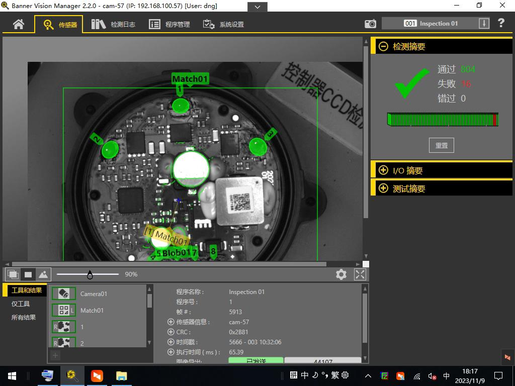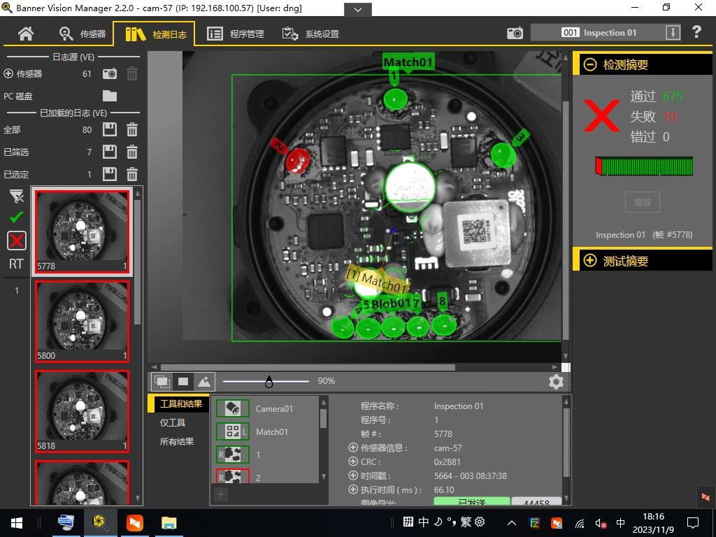 采用VE相机,配合红色环形低角度光源,采用二值化工具、逻辑工具等进行检测。